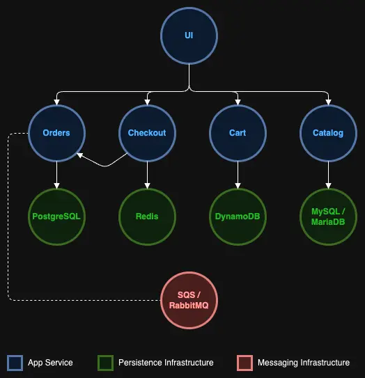 Each component in the sample application is implemented in its own namespace. For example, the 'ui' component is deployed in the 'ui' namespace, whereas the 'catalog' web service and 'catalog' MySQL database are deployed in the 'catalog' namespace.